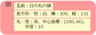 例として、日の丸の旗を考えてみます。下図のように、日の丸の旗は、図1.1に示すように「白い長方形」と「赤丸」とで構成されます。